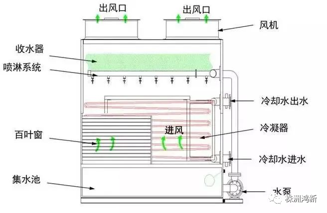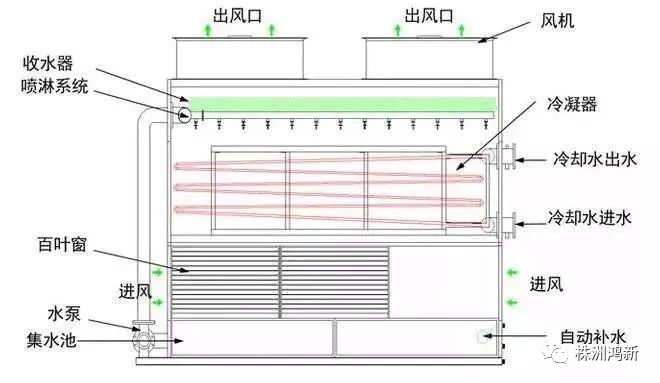 水滴在下降過程中還會遇到上升的空氣流,延緩了水粒的下降速度,從而延長了熱交換時間。 流體的熱量先傳給銅管內壁,再由內壁傳給銅管外壁,再又外壁傳給噴淋水膜,水膜和空氣形成飽和濕熱蒸汽,熱量由風機排入大氣,一部分水滴被收水器回收,減少噴淋水損失。